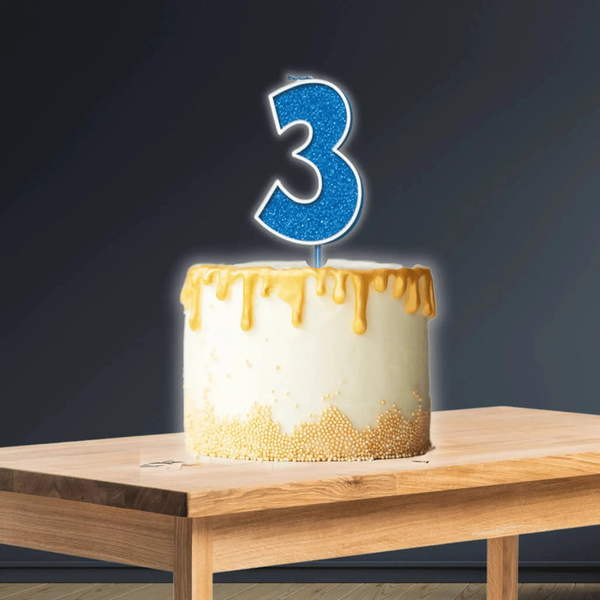Glitter Number 3 Candle – 7.5cm, Blue & Silver