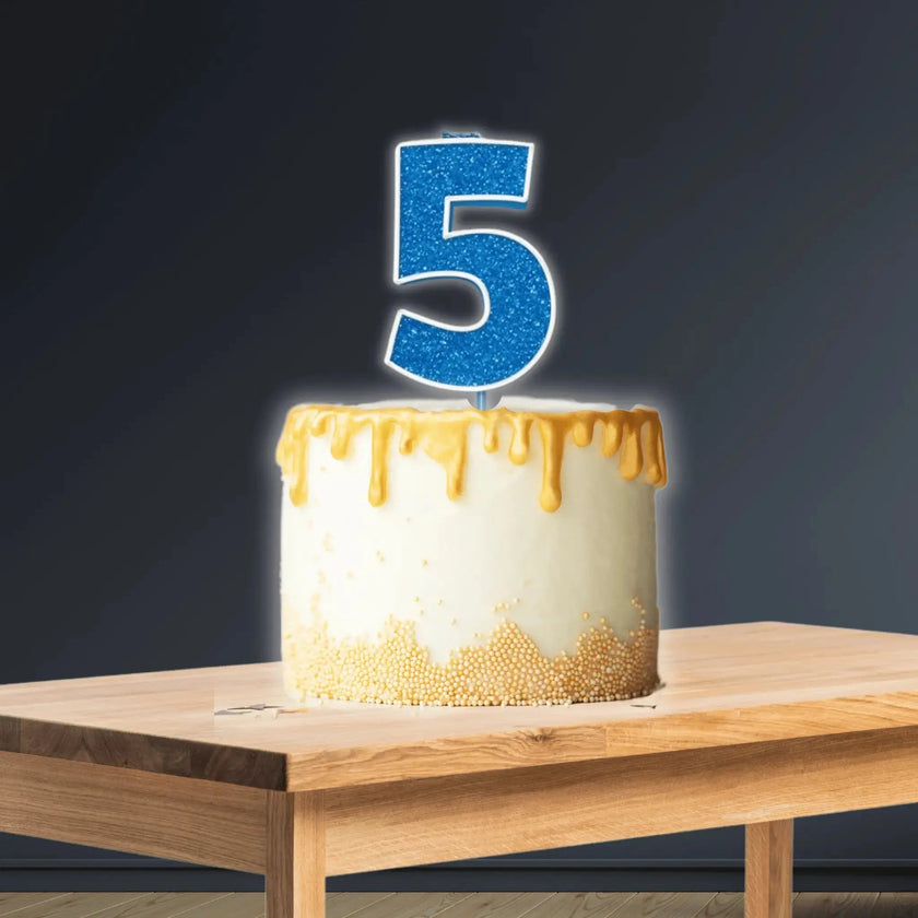 Glitter Number 5 Candle – 7.5cm, Blue & Silver