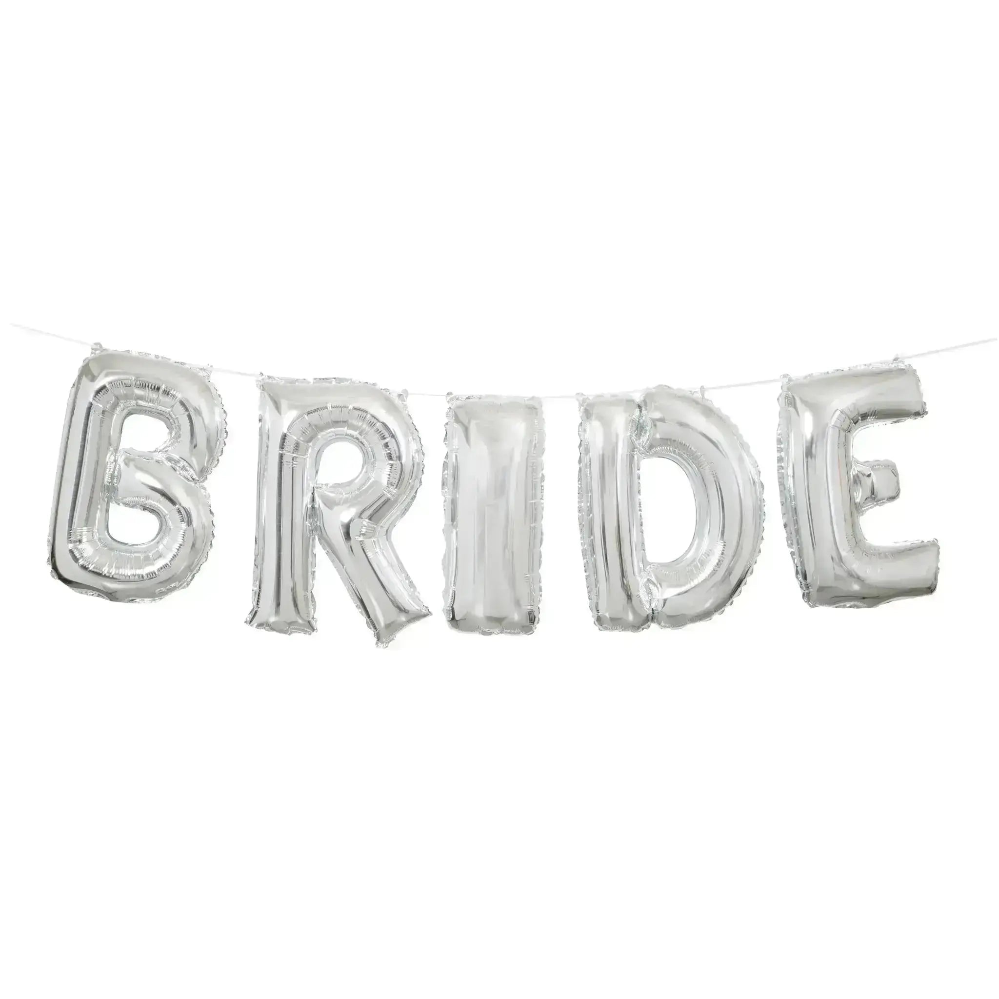 The Hen Party Balloon Banner - Bride Letters is a stylish and celebratory decoration, perfect for adding a touch of glamour and fun to any bachelorette party or hen do. This balloon banner features the word "BRIDE" in large, inflatable letters, each designed to make a statement and create a focal point for the celebration. The letters are typically crafted from high-quality foil material, offering a shiny, reflective surface that catches the light beautifully, contributing to the festive atmosphere.