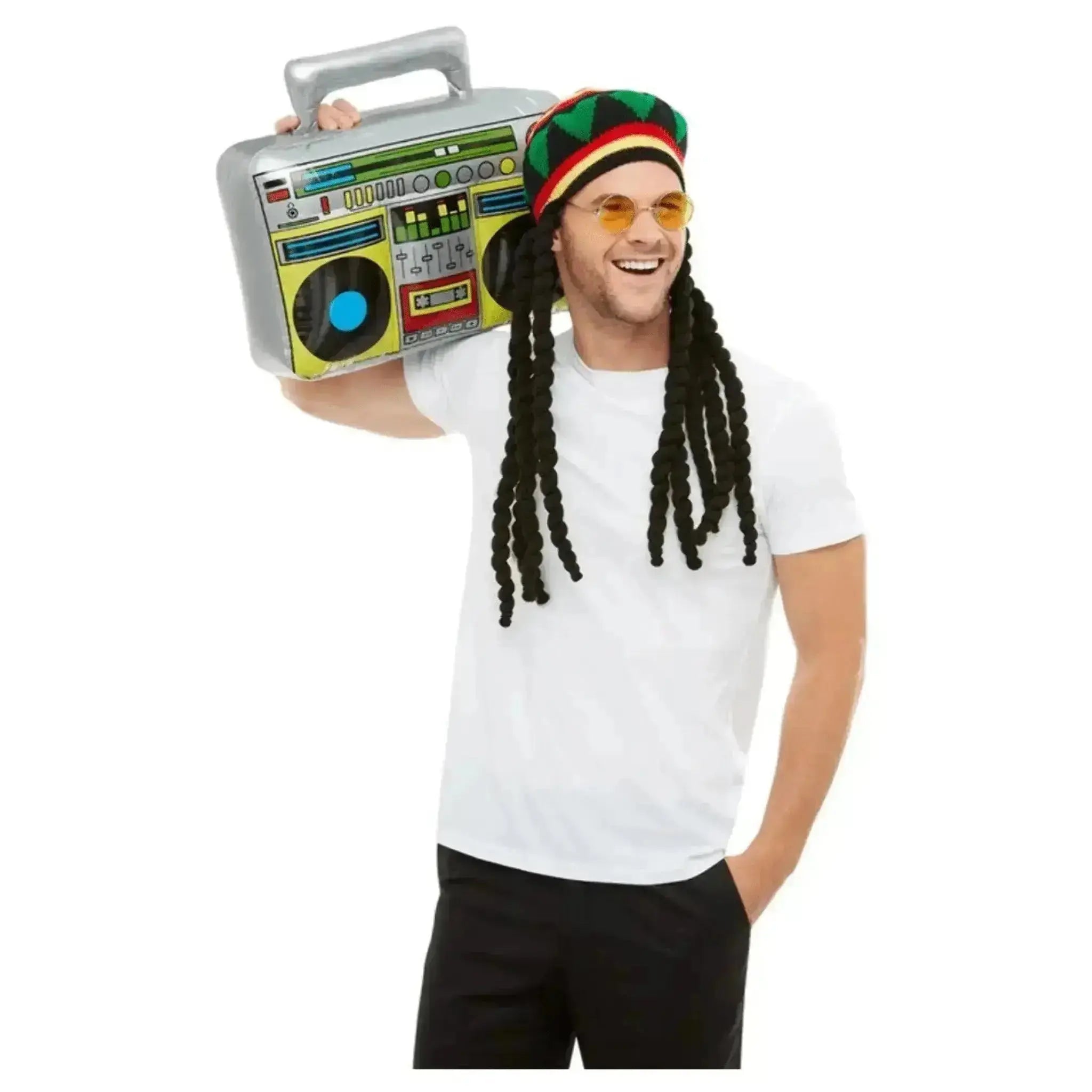 Together, the rasta hat with dreadlocks and inflatable radio create a dynamic and attention-grabbing costume that celebrates Jamaican culture in a playful and spirited way. Whether worn solo or as part of a group ensemble, the Jamaican Costume Kit is sure to bring joy and laughter to any occasion.