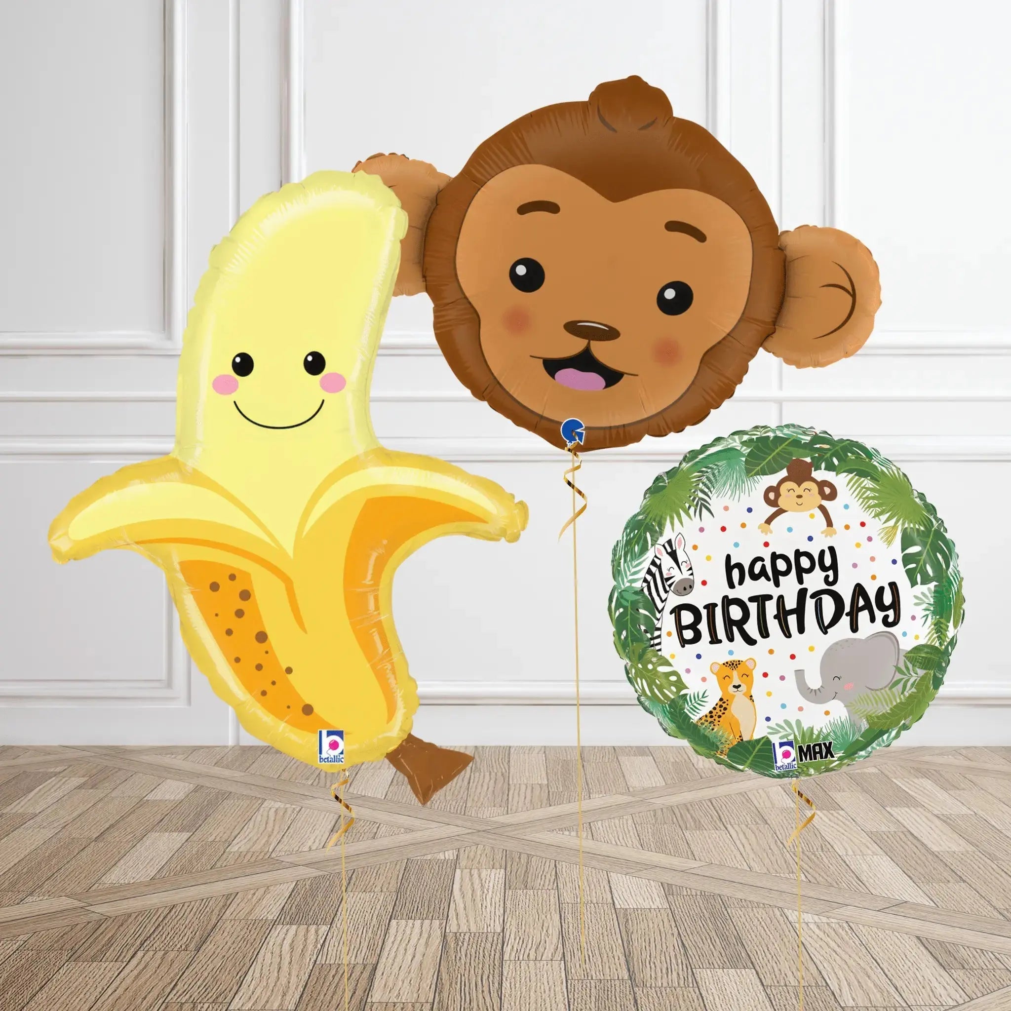 - Jungle Trio: Add a "Happy Birthday" safari-themed foil balloon to the monkey and banana for a celebratory display.