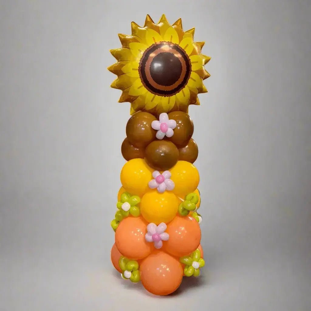 Illuminate your event with the cheerful charm of our Peachy Sunflower Stack. This delightful air-filled balloon display features a vibrant sunflower head set atop a carefully arranged stack of balloons in soft peach, sunny yellow, and warm mocha tones, perfectly capturing the essence of spring and summer.