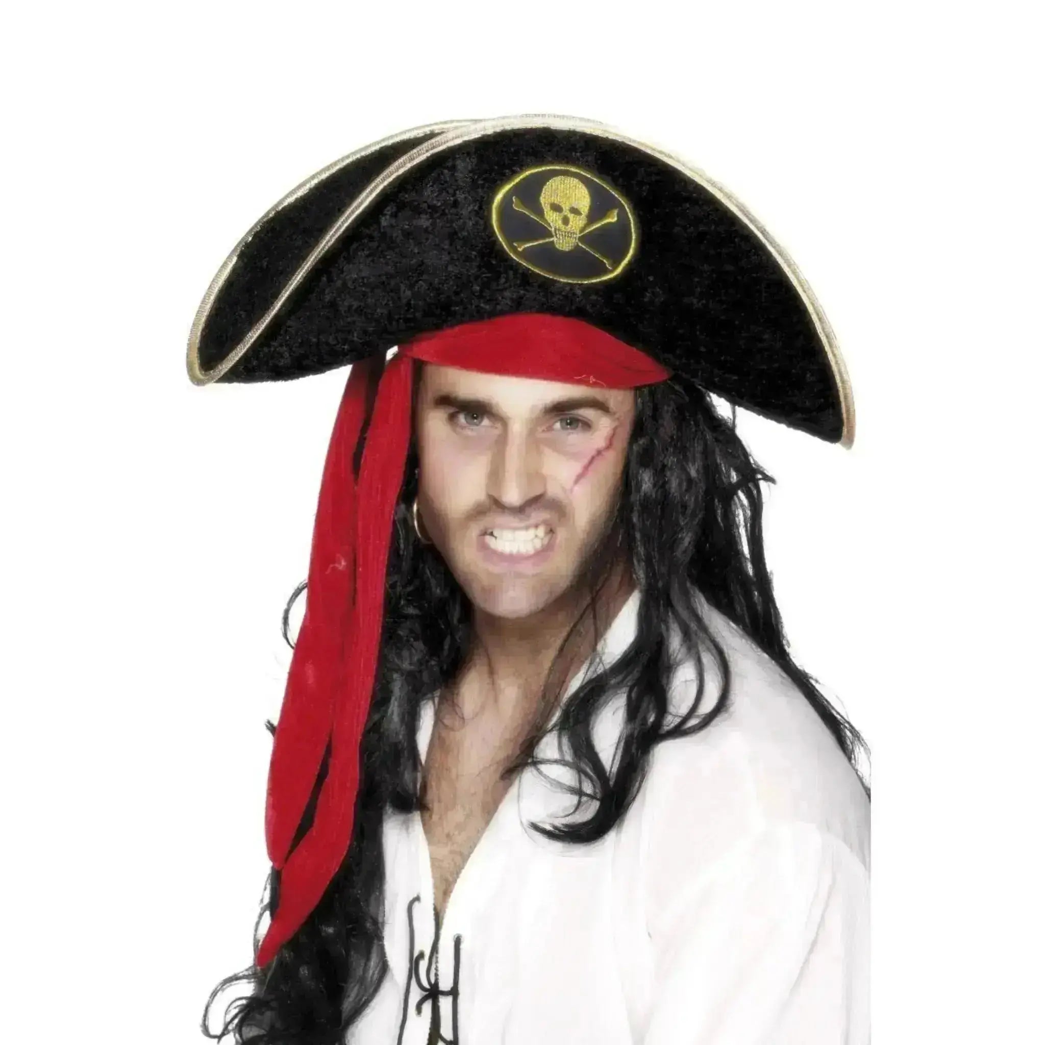 Sail the Seven Seas in style with this Pirate Hat with skull and crossbones design. Aya aye captain!.
