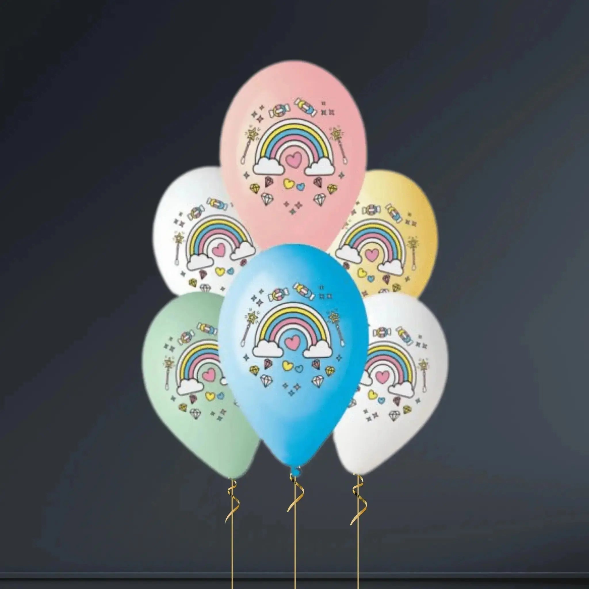 Brighten up your celebration with this cheerful pack of Rainbow Themed Latex Balloons! Featuring pastel colours (pink, blue, yellow, green, and white) and adorable rainbow designs with hearts, stars, and clouds, these balloons are perfect for birthdays, baby showers, or whimsical parties.
