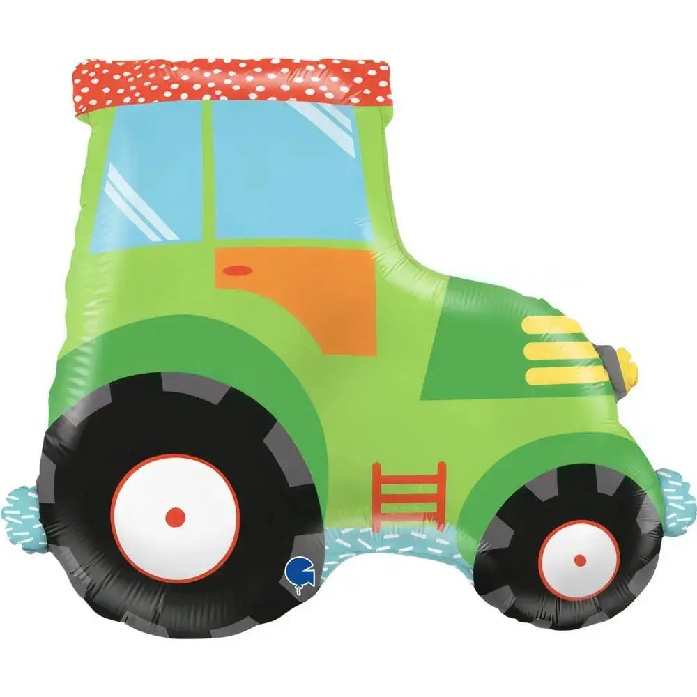 The balloon showcases a bright, colorful tractor complete with wheels, a cab, and realistic detailing that brings the vehicle to life. The high-quality printing on the foil material ensures that the colors are vivid and the details are sharp, making the balloon a standout piece in any decor.