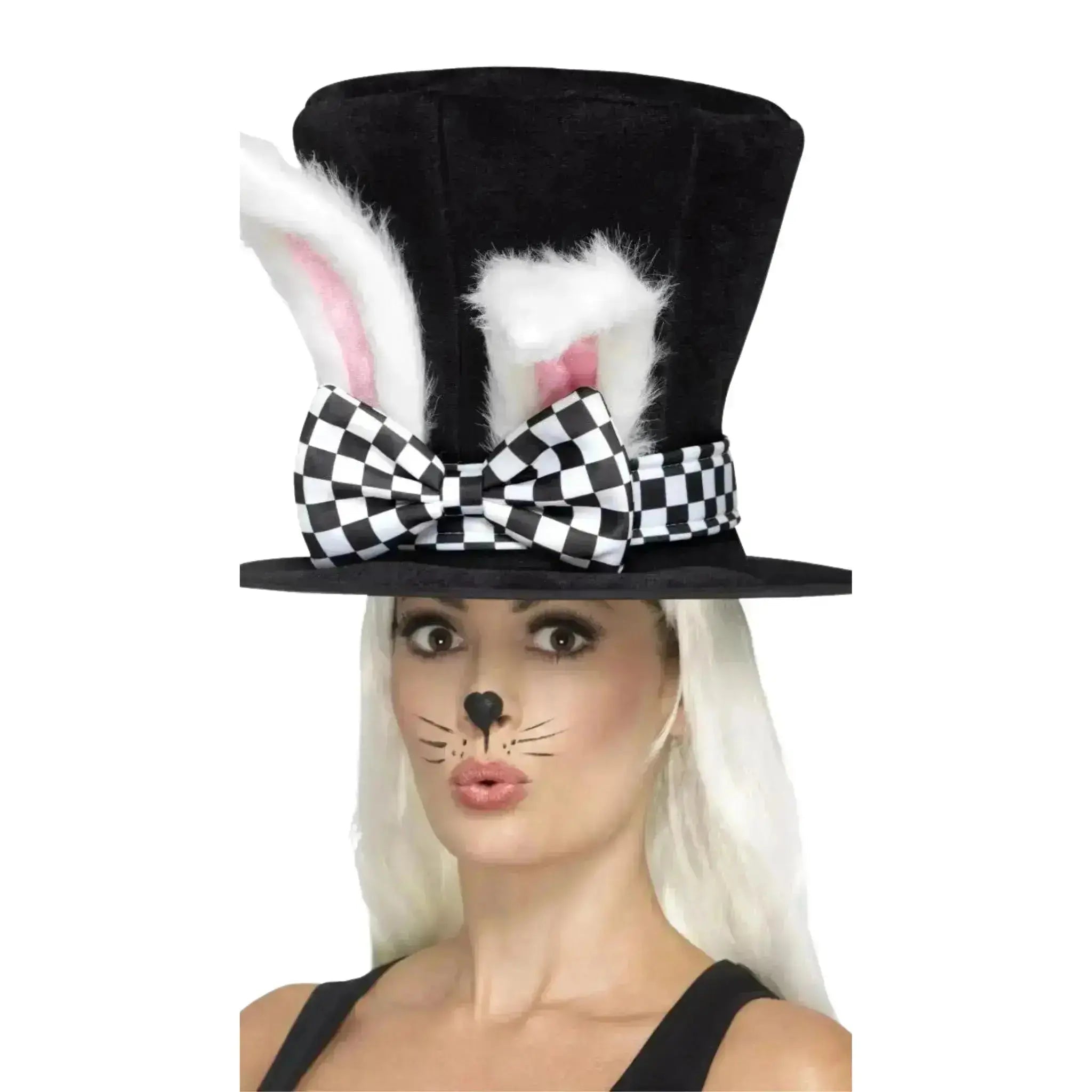 The hat features a classic top hat silhouette, rendered in a striking black and white color scheme that contrasts beautifully to catch the eye. Its design is accentuated by the addition of attached rabbit ears, which lend a delightful whimsy and evoke the mischievous spirit of the March Hare.