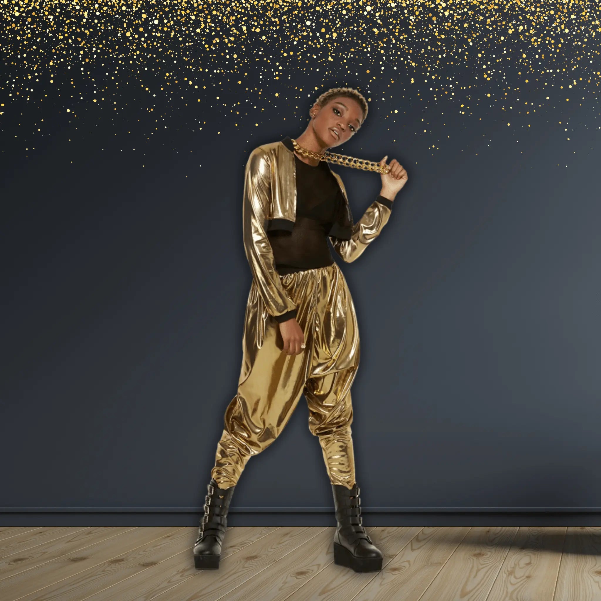 Turn heads and break it down in this dazzling Women's 80s Hammer Time Costume! Featuring bold, gold metallic harem trousers and a matching cropped jacket, this outfit is the ultimate tribute to iconic 80s hip-hop fashion. Designed for comfort and flair, the ensemble is perfect for themed parties, fancy dress events, or music nights that call for retro vibes. Pair it with chunky boots and bold accessories to complete the look. Be the life of the party and showcase your dance moves in pure 80s style!